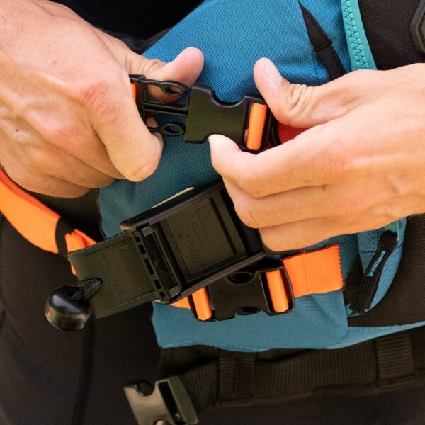 Hier ist eine hochklassige Schwimmweste, die für intensives und leistungsorientiertes Packrafting sowie Kajakfahren auf starkem Wildwasser und für Coaching entwickelt wurde. Mit einem anatomischen Schnitt bietet sie sehr guten Auftrieb und Schutz für den Körper, dank Schaumstoffverstärkungen, die um die Rippen angebracht sind. Die Weste öffnet sich an der Seite und lässt sich mit drei seitlichen Schnallen sowie einer Schulterverstellung anpassen.