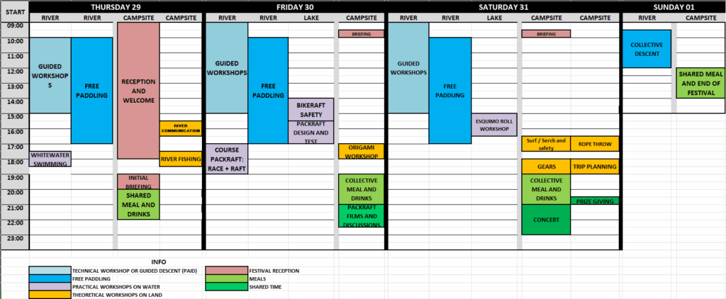 The objective of the Packraft Festival is to bring people together and have a great time paddling and learning new skills. We look after the campsite activities including pitch reservation, food service and on-site workshops but participant will need to organise paddling and logistics (getting to the put in or take out) themselves and are responsible for their own safety on and off the water.